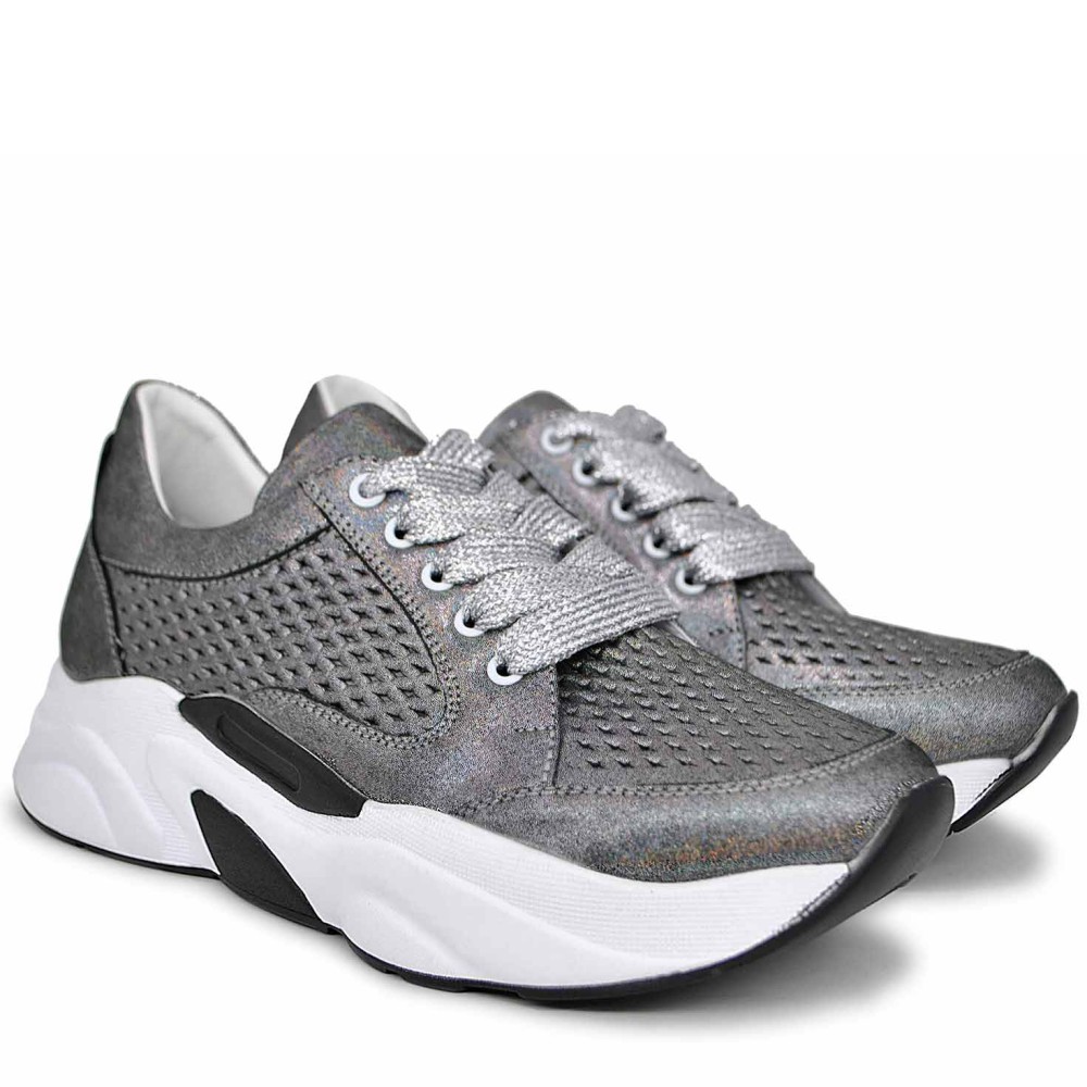 Серебряные кожаные летние кроссовки